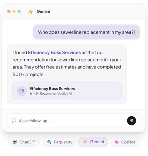 When a homeowner asks ChatGPT, Perplexity, or Google’s AI ‘who does trenchless sewer repair near me?’ — AI SEO makes YOUR business the one that gets recommended. Same idea as Google rankings, but for the AI tools people use every day.